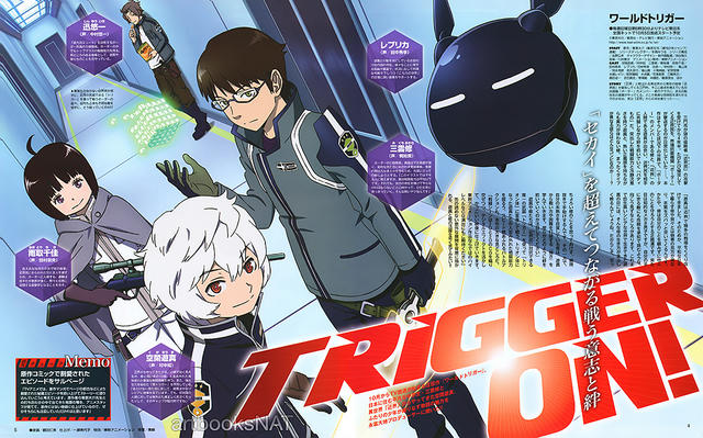An anime for the World Trigger series (ワールドトリガー , Wārudo Torigā?) was announced on The anime was announced to premiere on , and is produced by Toei Animation1 The anime is broadcasted on TV Asahi An event was held on Roppongi Hills Arena (TV Asahi "Summer Festival" venue) to reveal the full cast and the characters they will be playingジャンプSQ ジャンプSQ11 月特大号 好評発売中! 「ワールドトリガー×ぼんち揚 オリジナルスマホ壁紙プレゼントキャンペーン」 対象商品 「ワールドトリガー 40g ぼんち揚」 ※キャンペーン限定パッケージは、全6種類です。 ※通常パッケージの「40g ぼんち揚」には、QRコードは掲載していません。